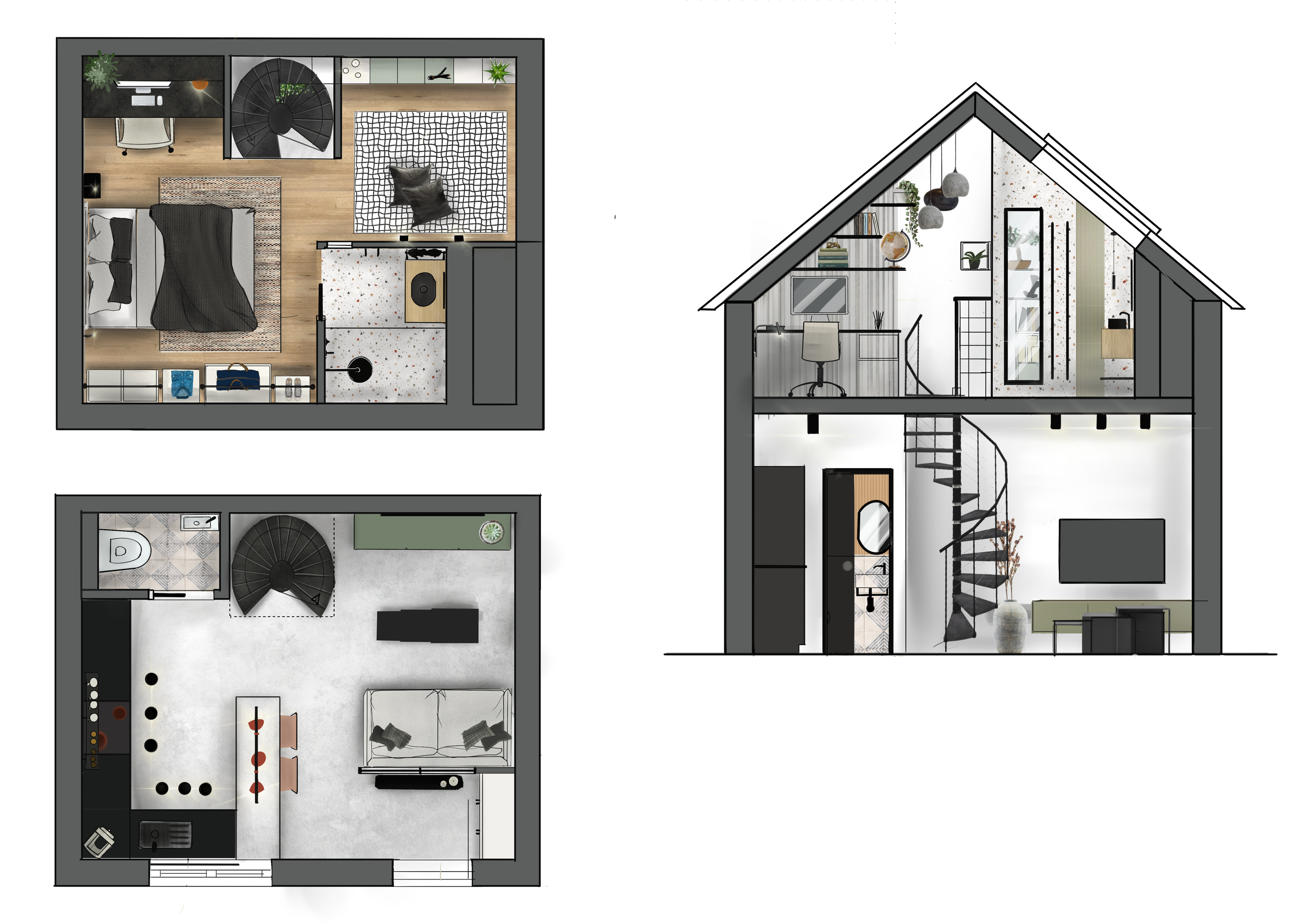 Ce projet propose l’aménagement d’un studio de 20 m² destiné à un jeune étudiant, conçu dans le cadre de l’extension d’un logement familial. L’objectif était de créer un espace autonome et fonctionnel intégrant couchage, cuisine, espace de travail et salle de bain, malgré une surface réduite.